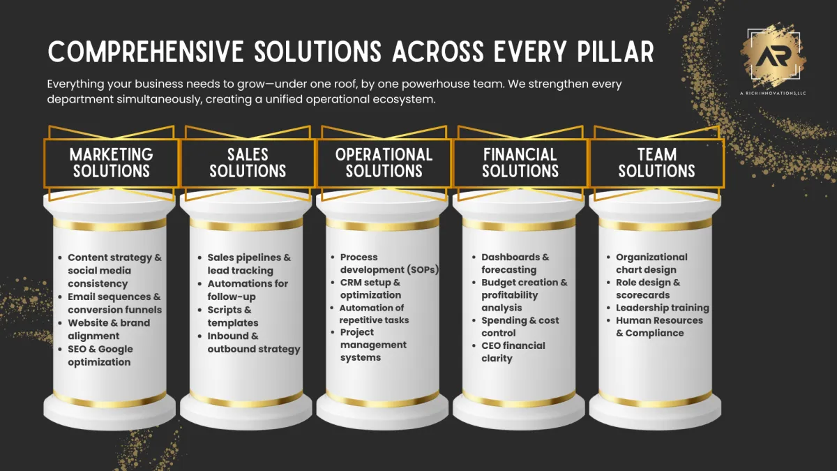 A Rich Innovations brings businesses to “the Island” — a space created for clarity, creativity, and construction. Here, leaders step out of chaos and into a guided framework where their ideas are transformed into systems, strategies, and sustainable growth.